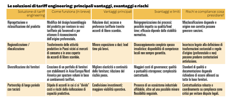 In questo contesto di incertezza geopolitica e di oscillazioni tariffarie, le imprese stanno ricorrendo sempre più frequentemente al tariff engineering. Questo termine indica una serie di soluzioni basate sul rivedere/riprogettare il design del prodotto, la rete di fornitori e la loro distribuzione geografica, il luogo degli stabilimenti produttivi e le relative operazioni ivi svolte, il luogo di stoccaggio delle merci (semilavorati e prodotti finiti), per ridurre l’esposizione a dazi ed altri fattori di natura legale e fiscale garantendo tuttavia il rispetto delle normative vigenti in tutte le giurisdizioni in cui si opera. In altre parole, le imprese possono scegliere di rilocalizzare parte dei processi produttivi in paesi non soggetti a dazi per ridurre i costi di accesso a determinati mercati. Più in generale, l’aumento dei costi legati ai dazi può suggerire una revisione dei flussi di import/export e dei relativi componenti o processi per rientrare in categorie tariffarie più favorevoli.